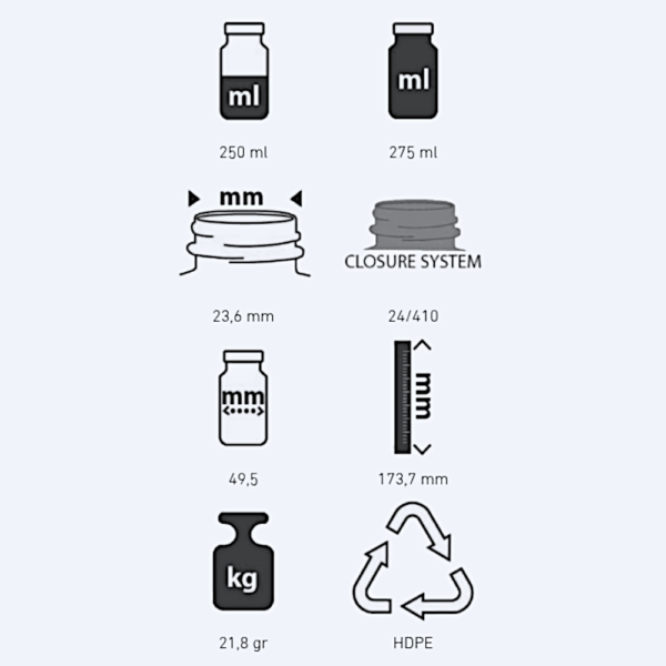 Frasco Cilíndrico 250ml D24 HDPE Branco com várias opções de tampa